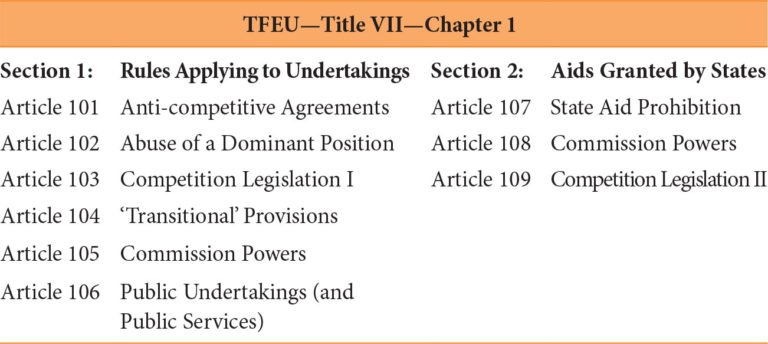 This also explains the position of the competition provisions within the EU Treaties. They are found in Chapter 1 of Title VII of the TFEU. The chapter is divided into two sections—one dealing with classic competition law, that is: ‘[r]ules applying to undertakings’; the other with public interferences in the internal market through ‘[a]ids granted by States’. Table 12.1 provides an overview of the various competition rules within the EU Treaties.