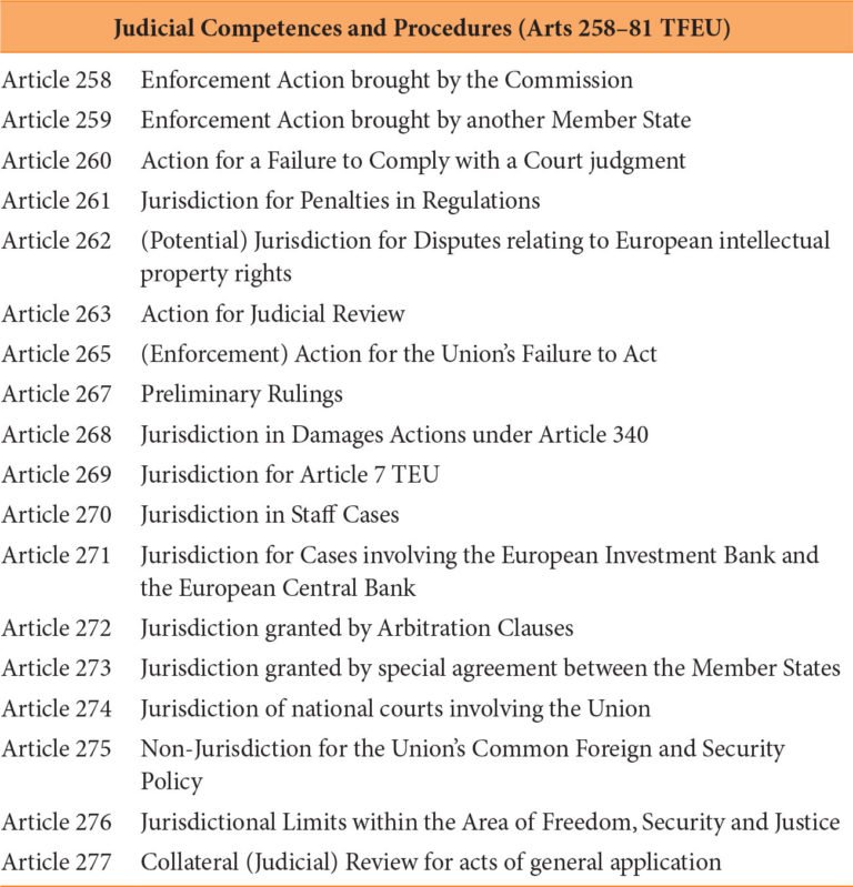 The European Treaties establish a dual enforcement mechanism for European Union law. Apart from decentralized enforcement by national courts, the Union legal order also envisages centralized enforcement of European law in the European Courts. The judicial competences of the European Courts are enumerated in the section of the Treaty on the Functioning of the European Union dealing with the Court of Justice of the European Union (Table 8.1).