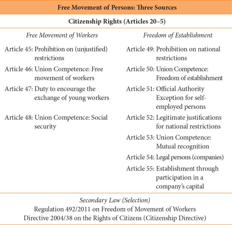 The Treaties thereby distinguished between two classes of economic migrants, namely employed and self-employed persons; and today’s Treaty title dealing with persons still addresses ‘Workers’ and the ‘Right of Establishment’ in two separate chapters. Each of the two chapters thereby contains a central prohibition that outlaws restrictions to the free movement of persons and which covers both ‘import’ restrictions as well as ‘export’ restrictions that persons may face when wishing to move from one State to another. Both chapters also contain a number of harmonization competences for the Union. These competences have been widely exercised in the past; and for this reason, European law on the free movement of persons is a rich mixture of primary and secondary law.