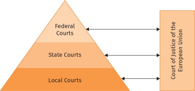 Functionally, the direct effect (and supremacy) of European law thus transforms every single national court into a ‘European’ court. This decentralized system differs from the judicial system in the United States in which the application of federal law is principally left to ‘federal’ courts. Federal courts here apply federal law, while State courts apply State law. The European system, by contrast, is based on a philosophy of cooperative federalism: all national courts are entitled and obliged to apply European law to disputes before them. In opting for the decentralized judicial enforcement via State courts, the EU judicial system thereby comes close to German judicial federalism; yet, unlike the latter, State courts are not hierarchically subordinated. Indeed, there is no compulsory appeal procedure from the national to the European Courts; and the relationship between national courts and the European Court is thus based on their voluntary cooperation. National courts are consequently only functionally—but not institutionally—Union courts. The three distinct models of judicial federalism can be seen in Figure 7.1.