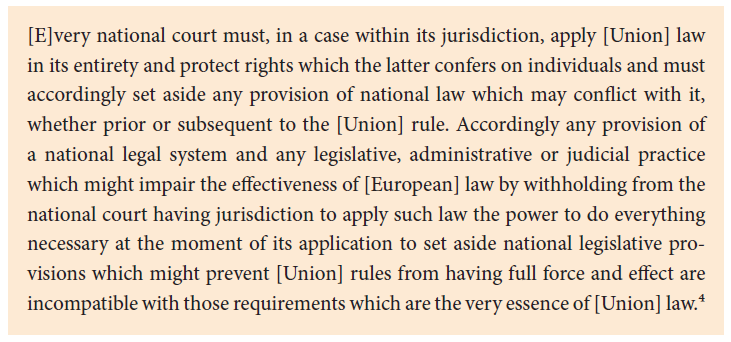 National courts are the principal judicial enforcers of European law. ‘Ever since Van Gend en Loos the Court has maintained that it is the task of the national courts to protect the rights of individuals under [Union] law and to give full effect to [Union] law provisions.’ Indeed, whenever European law is directly effective, national courts must apply it; and wherever a Union norm comes into conflict with national law, each national court must disapply the latter. The Union legal order thereby insists that nothing within the national judicial system must prevent national courts from exercising their functions as ‘guardians’ of the European judicial order. In Simmenthal, the Court thus held that each national court must be able to disapply national law—even where the national judicial system traditionally reserved that power to a central constitutional court: