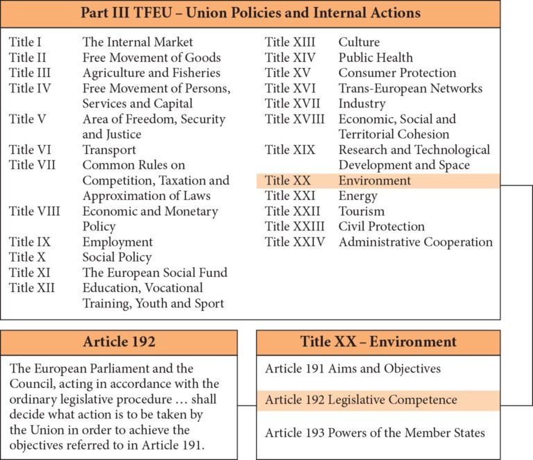 What are these material fields in which the Union is entitled to legislate? The Treaties do not enumerate the Union’s competences in a single list. Instead, the EU Treaties pursue a different technique: they attribute legislative competence for each and every Union activity in the respective Treaty title dealing with that activity. Each policy area contains a provision—sometimes more than one—on which Union legislation can be based. The various ‘Union policies and internal actions’ are set out in Part III of the TFEU (Table 3.1).