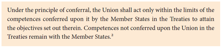 Under the principle of conferral, the Union shall act only within the limits of the competences conferred upon it by the Member States in the Treaties to attain the objectives set out therein. Competences not conferred upon the Union in the Treaties remain with the Member States.